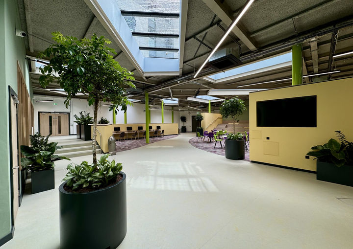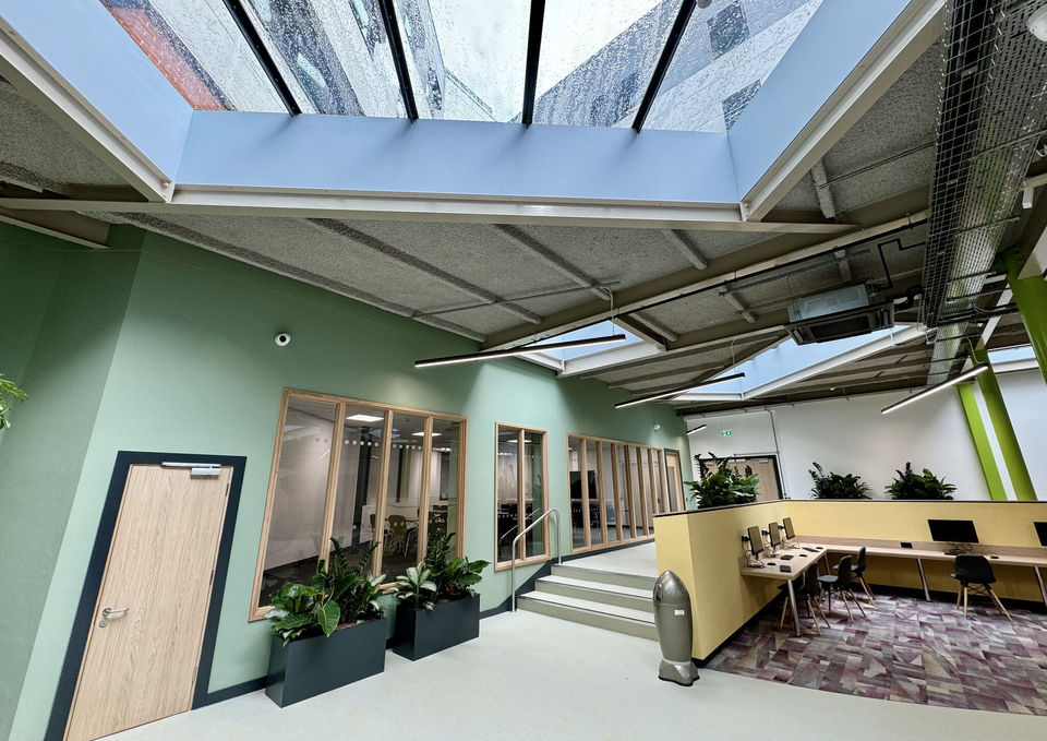 This fast track Design and Build project features an atrium infill incorporating extensive roof lights to maximise natural light and a timber staged seating area.