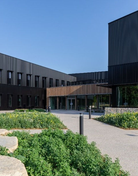 The central entrance features a biodiverse green roof, enhancing the building’s environmental credentials.